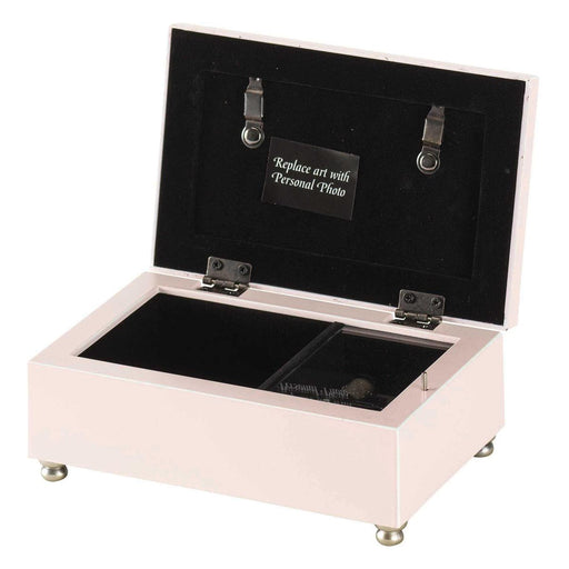 View full detailsThis sweet little music box features a light pink finish and beaded trim at edge. The hinged lid is also a double window photo frame; it comes with...