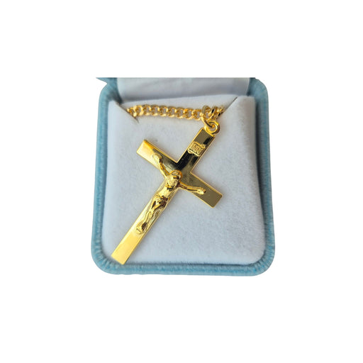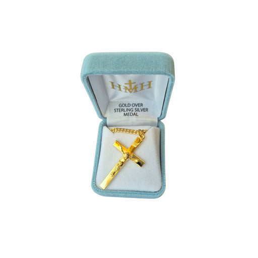 Crucifix pendant. 16kt Gold over solid sterling silver high polished. 24" chain. Made in USA. Deluxe velvet gift box.
