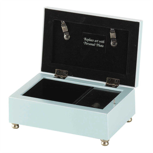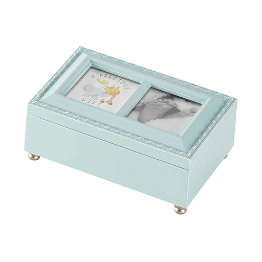 View full detailsThis sweet little music box features a light blue finish and beaded trim at edge. The hinged lid is also a double window photo frame; it comes with...