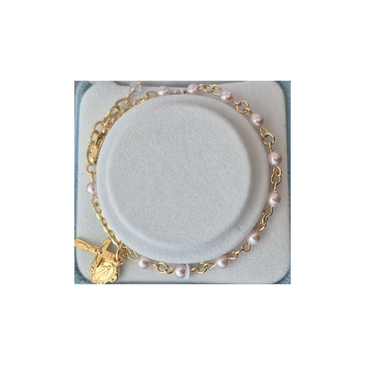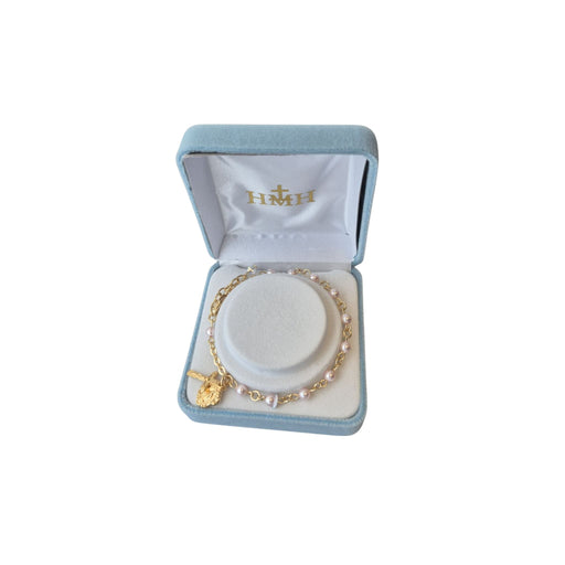 4mm pink imitation pearl beads. Gold plated. Deluxe velvet box. Made in the USA.