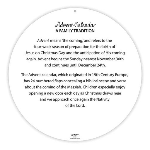This large, round Advent Calendar includes a satin ribbon for hanging, and each door opens to reveal a Scripture verse and symbol. Material:Cardsto...