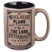 A patch with the sentiment taken from Proverbs 16:9 is printed on the Cafe au Lait colored coffee mug in black, and reads, “A Man's Heart plans his course, but the Lord determines his steps.” The inside of the Cafe au Lait colored ceramic mug is shaded in a coordinated a high gloss black. This handsome ceramic mug holds 14 fl oz of any beverage, hot or cold and it comes packaged in a gift box.