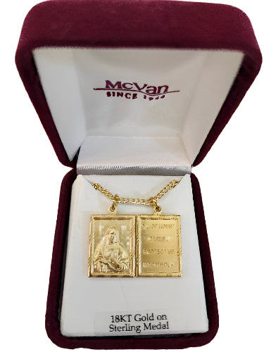Gold over sterling silver 2 piece scapular medal with 18" gold over brass chain. Comes in a red velvet box. Size: : 3/4" long. Reads: "Our Lady of ...
