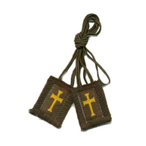 Genuine Brown Wool Scapular with Gold Embroidered Latin Crosses Brown Cord Scapular size: 1 3/4" x 2" Length 22".