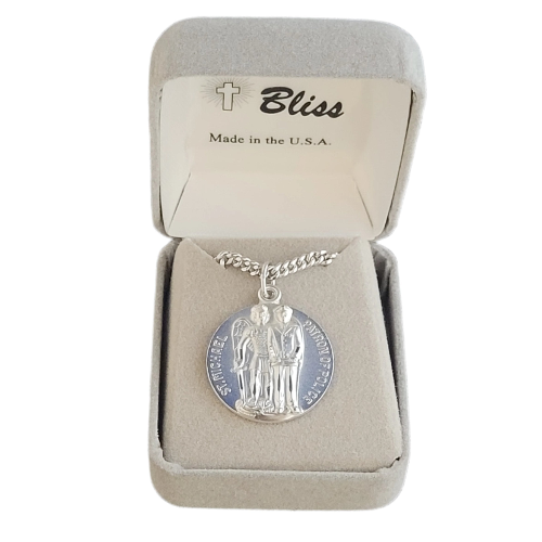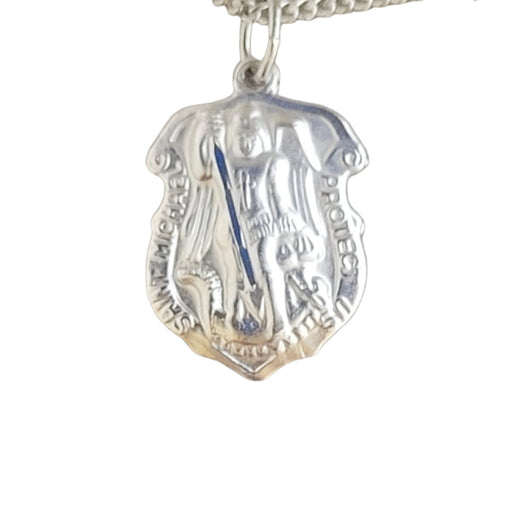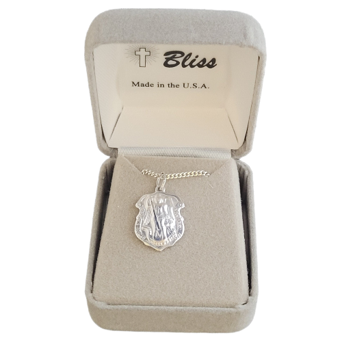 St Michael large shield medal is die struck/silver plated, 0.75" high and comes on a 18" chain with a claw clasp.