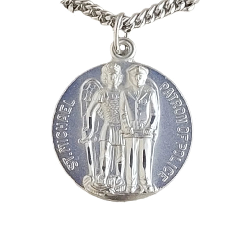 St Michael Police Officer medal is die struck/silver plated, 1" round and comes on a 24" endless chain.