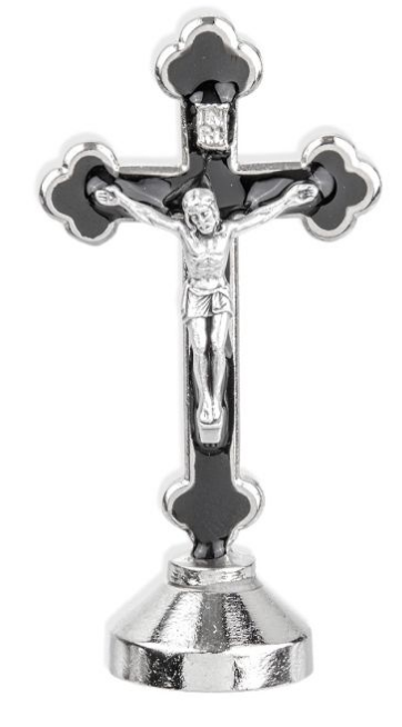 Silver Finished Standing Latin Crucifix with Black Epoxied Inlay. Antiqued Silver Metal Corpus and Finish. Comes with Magnetic and Adhesive Base. ...
