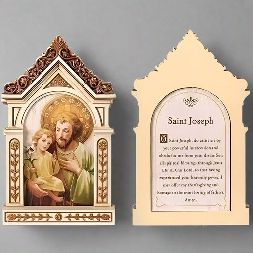 This table plaque features image of St Joseph on the front and a prayer on the back. Prayer on back reads: "O Saint Joseph, do assist me by your po...