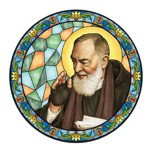 Features a full-color stained glass image of St. Pio on a durable vinyl Static will stick to most glass surfaces Remove, reposition and reuse Value...