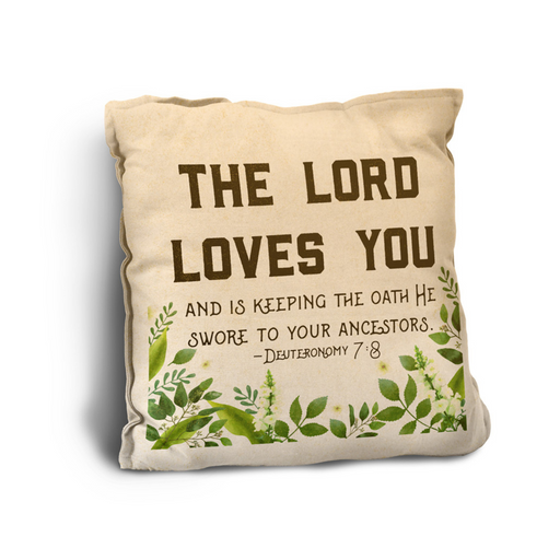 This Rustic Pillow features a quote from Deuteronomy, "The Lord Loves you and is keeping the oath he swore to your ancestors". It is great for couc...
