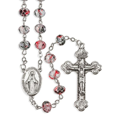Details 8mm Black Faceted Speckled Glass Bead Rosary. Fine detailed silver oxidized centerpiece and crucifix. 20 1/2" (520mm) Rosary length.