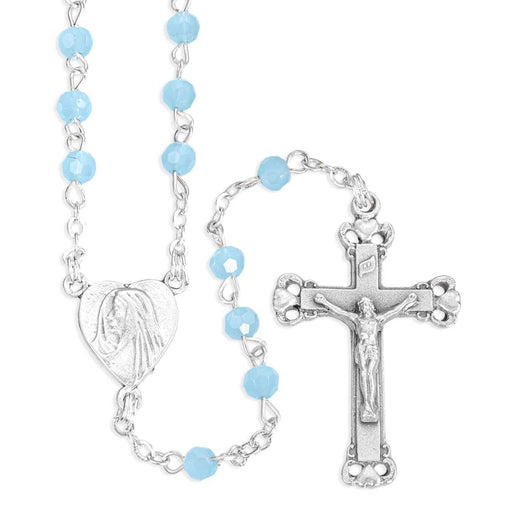 6mm Glass Blue Pearl Rosary with Ceramic Flowered Our Father Beads, O.L. of Grace Centerpiece and Crucifix in Clear Box.