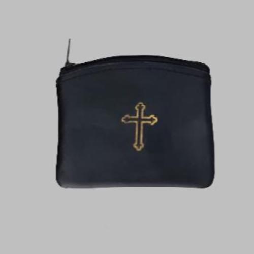 Black Leatherette Rosary Pouch with Gold Stamped Cross Image and Zipper Closure. Size: 2 1/2" x 3 1/4" Rectangle Shape.