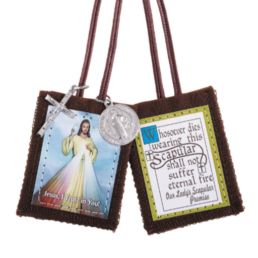 This Divine Mercy scapular features a traditional full-color Catholic image of Divine Mercy on one panel and Our Lady's Scapular Promise on the oth...