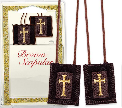 Genuine Brown Wool Scapular with Gold Embroidered Latin Crosses Brown Cord Scapular size: 1 3/4" x 2" Length 22". Carded in Clam Shell packaging