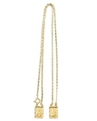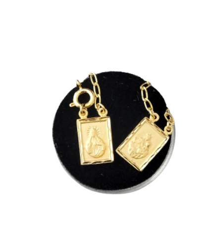 Golden scapular with image of Sacred Heart of Jesus and Our Lady of Carmel. Small, gold plated. .5" medal. 9" chain.