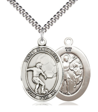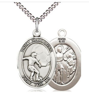 · St. Sebastian / Soccer Medal.· Medal Measures 1-inch tall by 3/4-inch wide.· Chain is 24 Inches in length Endless Rhodium Heavy Curb Chain.· St. ...