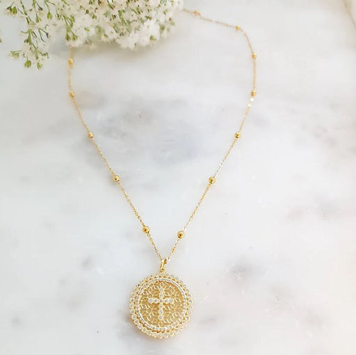 Our gold filled delicate chain with small gold filled beads is then finished with a beautiful filigree medallion charm with micro pave CZ round coi...