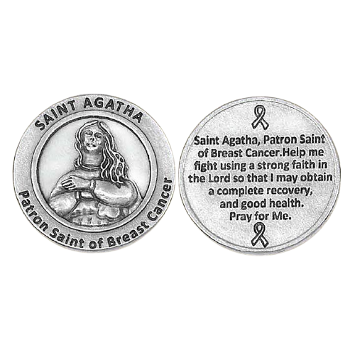 This silver-toned pocket token has a Saint Agatha picture on one side and a short prayer to Saint Agatha on the other side.