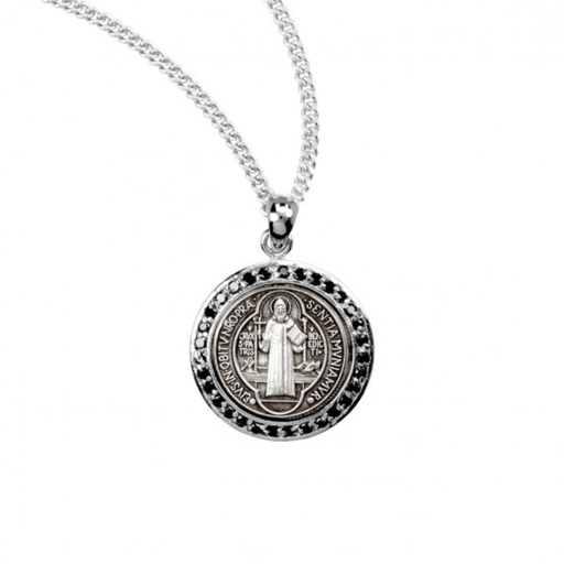 Saint Benedict round double sided medal-pendant, with black cubic zirconia "CZ" s. Solid .925 sterling silver. Saint Benedict is the protector aga...