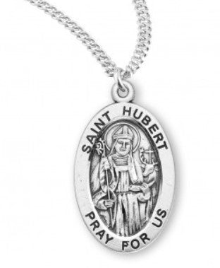 Details Silver Embossed Pamphlet with Saint Hubert Biography and Prayer. Genuine pewter Saint Hubert oval medal. 24" Stainless steel endless chain....