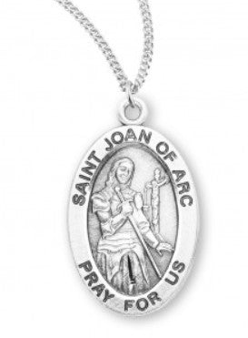 Saint Joan of Arc oval medal-pendant. Solid .925 sterling silver. Detail depicts her wearing armor and holding a sword. Saint Joan of Arc is the P...
