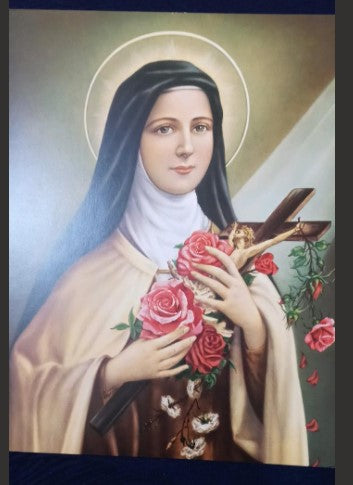 St Therese with Inner Linen Border in 12" x 14" Antique Gold Frame