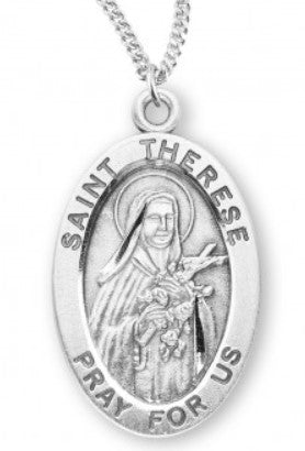 Saint Therese of Lisieux oval medal-pendant. Solid .925 sterling silver. Detail depicts her holding a crucifix and a bouquet of roses and she is d...
