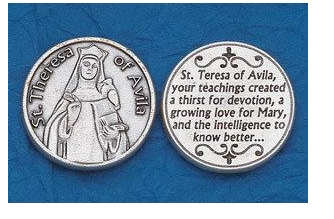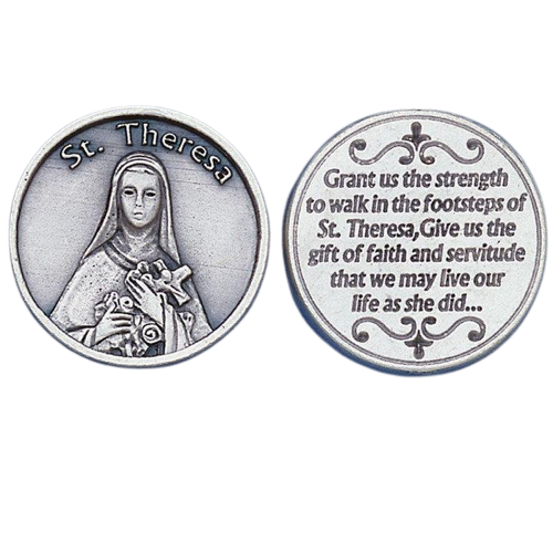 Details: Silver tone Pocket Token. St. Theresa with Prayer. Made in Italy.