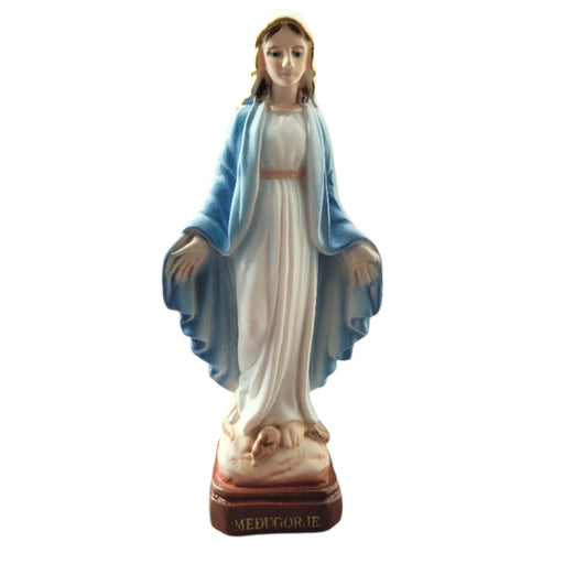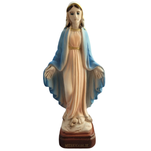 Statue of Our Lady of Medjugorje from Medjugorje. Our Lady is wearing a blue dress. 8.5" tall.
