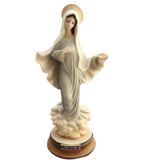Statue of Our Lady of Medjugorje from Medjugorje. Our Lady is wearing an off-white/grey dress. 8.5" tall.