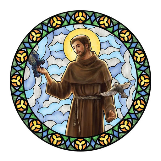 Features a full-color stained glass image of St. Francis on a durable vinyl Static will stick to most glass surfaces Remove, reposition and reuse V...