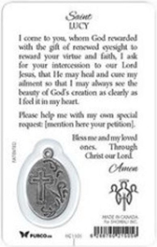 Saint Lucy Holy Card featuring gold edges. Artwork by Fratelli Bonella. Prayer in honor of Saint Lucy on the back. Card size: 2.0" x 4.0" (51mm x ...