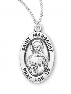 Saint Margaret oval medal-pendant. Solid .925 sterling silver. Detail depicts her holding an image of Jesus's Sacred Heart. Saint Margaret is the ...