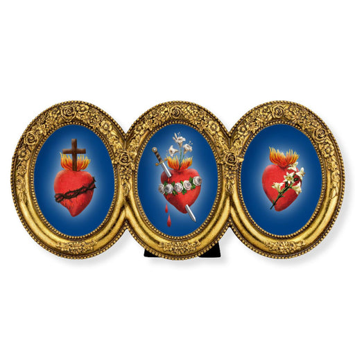 9"x4.5" The Three Hearts Triple Oval Gold Leaf Frame with Flowered Decoration Under Glass. Easel Back