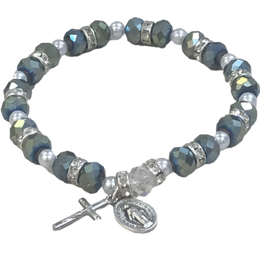 Smoke Sparkle Bead Rosary Bracelet with Strass Crystals. Miraculous Medal and Crucifix.