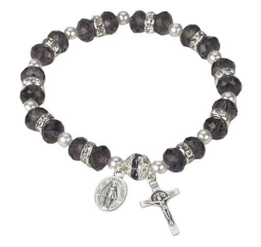 Italian crystal stretch bracelet in purple with Miraculous Medal and Crucifix.