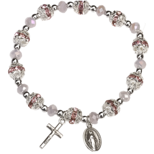 Rose Crystal Stretch Rosary Bracelet With Silver tone Miraculous Medal and Crucifix