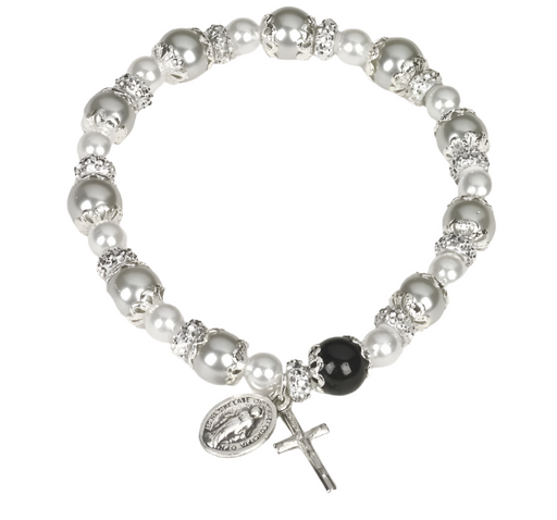 White Rosary Bracelet with Pearls and Black Our Father Bead