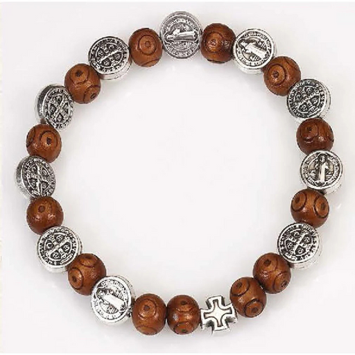 This elegant stretch bracelet blends spiritual symbolism with natural beauty. Featuring alternating wooden beads and silver-tone St. Benedict medal...