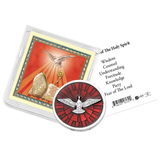 Confirmation Holy Spirit 2 Sided Pocket Coin with Antique Silver Finish and Red Epoxy. Size of Coin: 1 1/4" (32mm). Comes with a gold embossed Holy...