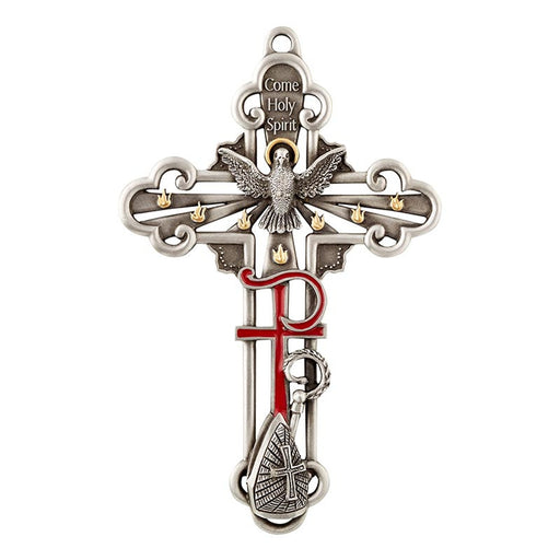 This pewter wall cross features a dove and bible emblem with red crystal embellishment, representing the tongues of fire and the 7 gifts of the Hol...