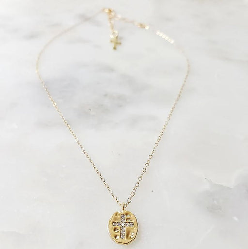 Simple is elegant! This 14 kt. gold-filled chain necklace is 14 inches in length with a 3-inch extension with a tiny closure cross. Hanging from th...