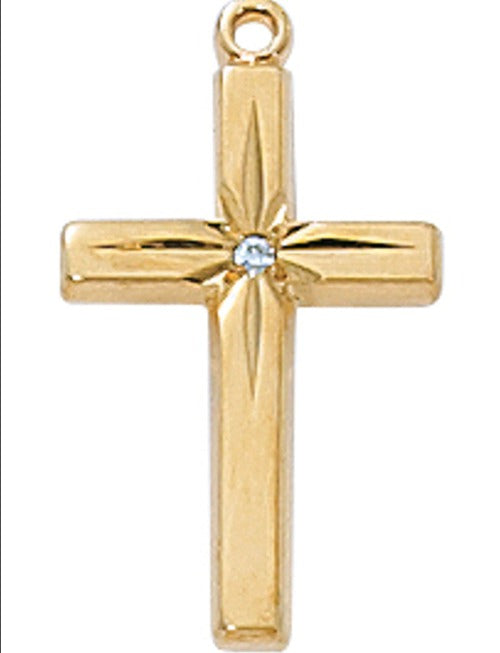 Single set crystal cubic zirconia "CZ" cross. 16kt Gold over sterling silver. Hand polished and engraved by New England Silversmiths. Dimensions: ...