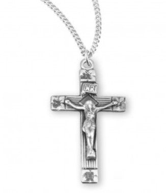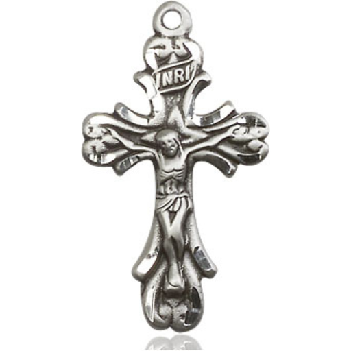 Flower tipped crucifix pendant. Solid .925 sterling silver. Medal is die struck. Hand polished and engraved by New England Silversmiths. Dimension...
