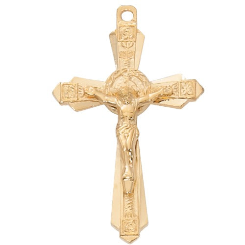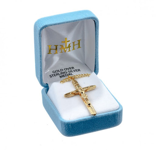 A large 1 1/2" tall crucifix made of gold over sterling silver with detailed engraving on the cross. Comes on a 24" gold over brass chain and in a ...