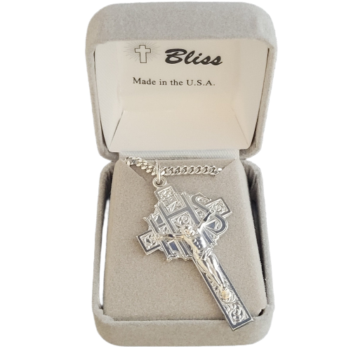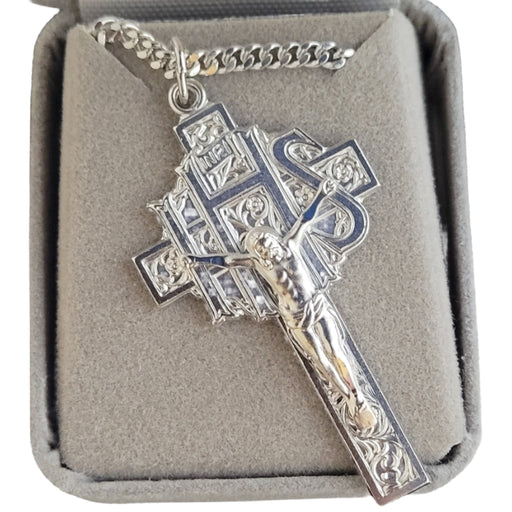 Crucifix IHS with vine detail is silver plated, 2" high and comes on a 24" endless chain.