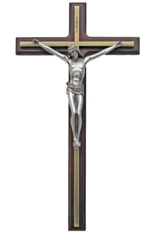 Crucifix 10" Wood Tone Two Tone Pewter and Gold