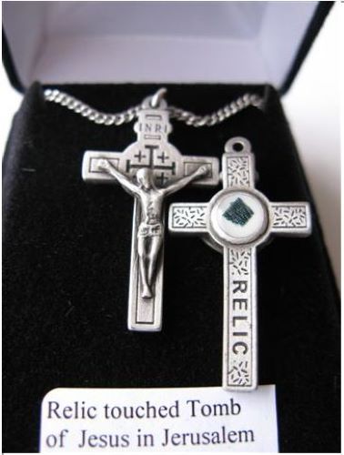 It's a pewter Crucifix with a relic that touched the tomb of Jesus, in the church of the Holy Sepulcher in Jerusalem. It comes with a 20" stainless...