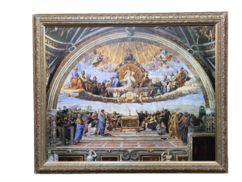 This image of the Dispute at the Blessed Sacrament by Raphaël is on canvas and is famed in a Venezia silver frame. The canvas size is 24" x 30".